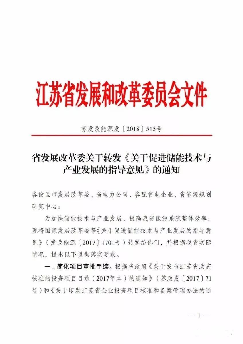 中國儲能網(wǎng)訊:6月1日,江蘇省發(fā)改委發(fā)布了《關(guān)于轉(zhuǎn)發(fā)<關(guān)于促進儲能技術(shù)與產(chǎn)業(yè)發(fā)展的指導(dǎo)意見>的通知》。除要求加強貫徹去年10月五部委發(fā)布的儲能發(fā)展指導(dǎo)意見外,還特地提出“簡化項目審批手續(xù)、加強規(guī)劃統(tǒng)籌發(fā)展和分級分類協(xié)調(diào)管理”等三大具體落實要求。