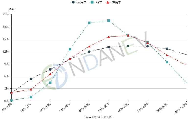 分類別看,不同類別新能源車輛充電開始SOC差異化分布。新能源乘用車充電開始SOC相對分散,其分布位于30%-90%范圍;新能源客車充電開始SOC集中在50%-60%區(qū)間內(nèi);新能源專用車充電開始SOC集中在60%-70%(如圖1所示)。數(shù)據(jù)表明,運營車輛充電相對規(guī)律和集中,而乘用車由于應用領域廣,個性化差異大,充電分布較為均勻。