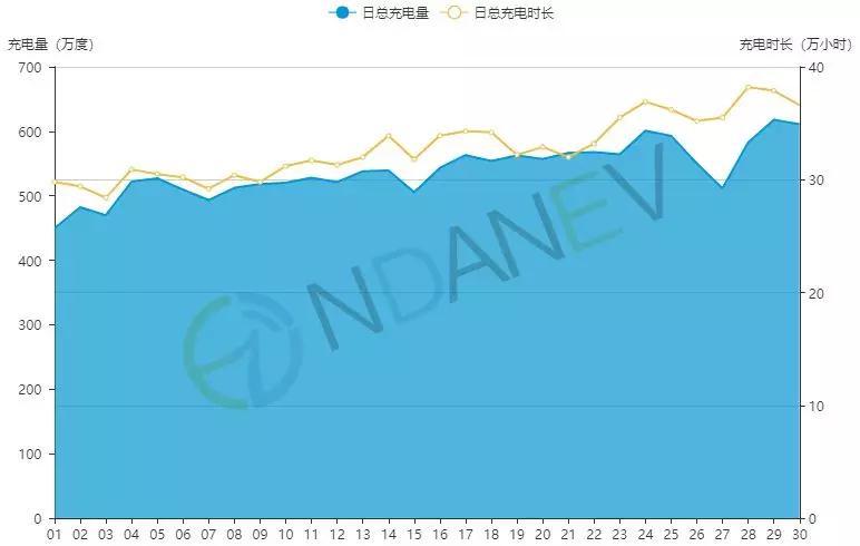 從日總充電量和充電時長來看,4月份新能源汽車日總充電量在400-600萬度之間,日總充電時長在30-40萬小時(如圖2所示),充電量和充電時長較3月份均有大幅度提高。同時,結合充電量和充電時長曲線,可以看出總充電量變化與充電時長變化曲線較為一致,具有正相關性,這表明慢充是當下新能源汽車充電的主要形式,偶爾才會出現(xiàn)快充集中現(xiàn)象。
