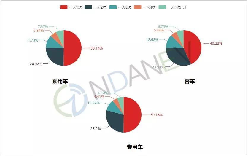不同類別車輛日總充電次數(shù)占比情況,新能源乘用車方面,超過一半的新能源汽車一天僅沖一次電,充電次數(shù)為1-2次占比達到75.06%,與上月基本持平;新能源客車方面,一天僅沖一次電的占比為43.22%,充電次數(shù)為1-2次占比達到75.13%,較上月提高1.33個百分點;新能源專用車方面,一天僅沖一次電的占比為51.16%,充電次數(shù)為1-2次占比為79.15%,較上月提高0.54個百分點(如圖3所示),表明新能源汽車充電頻率有所降低。隨著技術進步,新能源汽車動力蓄電池續(xù)航里程的持續(xù)提高,動力電池充電次數(shù)呈現(xiàn)下降趨勢。