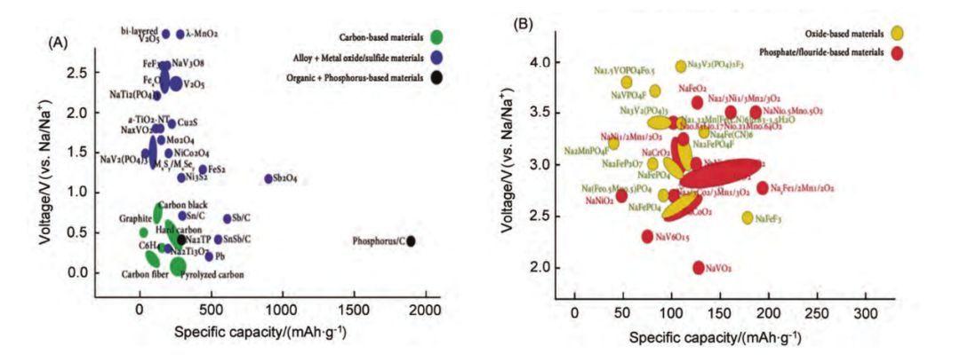 左圖為鈉離子電池常見的正極材料,右圖為常見的負(fù)極材料(橫坐標(biāo)為克容量,縱坐標(biāo)為標(biāo)準(zhǔn)電勢)
