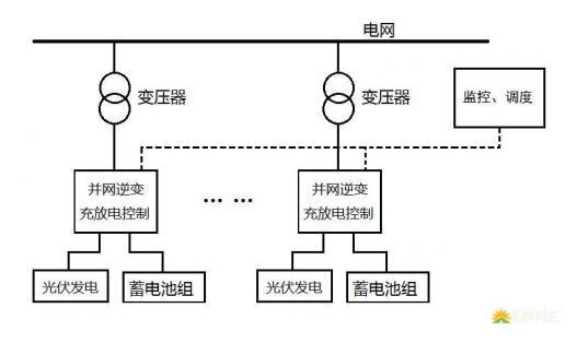 該系統(tǒng)光伏發(fā)電陣列發(fā)出的電力在逆變器前端就與蓄電池進(jìn)行了自動(dòng)直流平衡,這種模式的主要特點(diǎn)是系統(tǒng)效率高,電站發(fā)電出力可由光伏電站內(nèi)部調(diào)度,可以達(dá)到無縫連接,輸出電能質(zhì)量好,輸出波動(dòng)非常小等,可大大提高光伏發(fā)電輸出的平滑、穩(wěn)定性和可調(diào)控性能,缺點(diǎn)是使用的逆變器需要特殊設(shè)計(jì),不適用于對現(xiàn)有已經(jīng)安裝好的大部分光伏電站進(jìn)行升級改造。另一個(gè)缺點(diǎn)是,該儲能系統(tǒng)中的蓄電池組只能接受本發(fā)電單元的電力為其充電,而其他臨近的光伏發(fā)電單元或電站的多余電力無法為其充電。也就是說這種方案缺乏大電站內(nèi)部電力調(diào)配的功能。