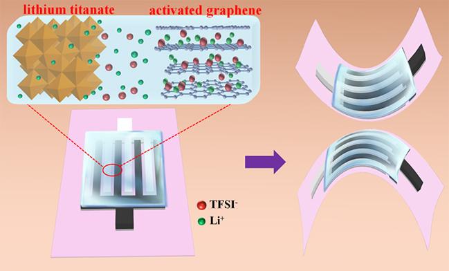 最近,該研究團(tuán)隊(duì)在國(guó)際上率先開(kāi)發(fā)出一種新概念的全固態(tài)柔性平面鋰離子微型電容器。該微型電容器以高導(dǎo)電石墨烯為集流體,以高電壓離子凝膠作為電解質(zhì),以納米鈦酸鋰為負(fù)極和活化石墨烯為正極構(gòu)筑出高離子電子傳導(dǎo)的平面交叉指型微電極,進(jìn)而在一個(gè)基底上組裝出全固態(tài)鋰離子微型電容器。該鋰離子微型電容器具有高能量密度53.5mWh/cm3,高于目前報(bào)道的鋰薄膜電池和微型超級(jí)電容器。同時(shí),該鋰離子微型電容器具有優(yōu)異的循環(huán)穩(wěn)定性,6000次循環(huán)后電容保持率為98.9%;具有高溫電化學(xué)穩(wěn)定性,能在80°C條件下穩(wěn)定工作;以及具有優(yōu)異的機(jī)械柔性,在各種彎曲和扭曲狀態(tài)下達(dá)到性能基本沒(méi)有衰減。此外,該鋰離子微型電容器表現(xiàn)出良好的模塊化集成能力,無(wú)需金屬連接體,可有效調(diào)控輸出的工作電壓和容量。因此,該工作為開(kāi)發(fā)柔性化、小型化、智能化儲(chǔ)能器件提供了新的策略。