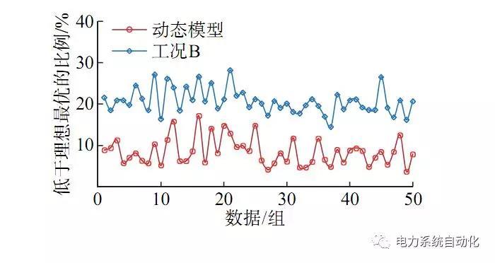 以預測曲線計算出動態(tài)效率模型和常數模型下的出力,在預測曲線上添加隨機誤差(本次分析重復50次),分析兩種模型下的日前優(yōu)化出力在添加誤差后的實際效果,其中基準值為添加誤差后新曲線的最優(yōu)理想消納效果。由圖8可以看到,動態(tài)模型給出的出力計劃與理想最優(yōu)效果差距平均為8.49%,而以B工況的出力效果與理想最優(yōu)的差距平均為20.70%,在預測誤差的干擾下,動態(tài)模型消納效果受到的影響相對較小,這是動態(tài)模型下的儲能出力在較高的效率區(qū)域的緣故。