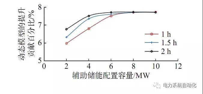圖7表示了充電環(huán)節(jié)提升效果受輔助儲能容量的影響,其縱坐標表示混合儲能通過提高效率帶來的消納提升,這部分提升在常數效率模型中無法獲得。3條曲線對應不同放電時長的輔助儲能,即最大存儲電量容量不同??梢钥吹捷o助儲能加入后,對動態(tài)效率的提升存在一個飽和值,這是因為當混合儲能聯合運行將儲能都優(yōu)化到高效率點以后,來自于動態(tài)效率模型的消納提升則飽和。
