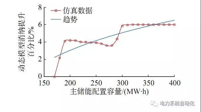 假設主儲能的容量在170MW·h~400MW·h之間變化,得到單一儲能模式下消納提升效果與儲能容量的關系曲線如圖6所示(放電時段均為最大效率)??梢园l(fā)現,消納提升效果的百分比總趨勢隨容量增加而增加;當容量增加到一定水平后,改善效果趨于飽和,不再增加。通過這組曲線,也可以為風儲聯合系統的儲能優(yōu)化配置提供借鑒。