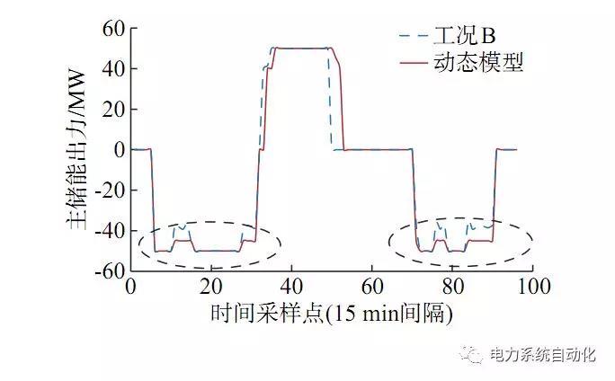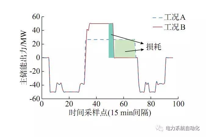 在動態(tài)效率模型下,其特性是放電功率小對應效率低,放電功率大對應效率高,因此,不同放電功率下的等效消納電量不同,放電功率越低則消納電量越小,放電過程中損失的能量越大。圖3給出了主儲能放電時段的A、B兩種極限情況,B以最大功率即對應最高效率放電,可釋放能量的等效消納電量最大;而A的放電功率及對應效率最低,更多的能量被損耗,等效消納電量最小,B工況即為考慮動態(tài)效率模型下的最優(yōu)結果。常數、動態(tài)模型的消納效果最大差異值即為A、B工況的差值,相對差值為34.74%,一般常數效率取效率曲線的平均值,其消納差異會小一些。