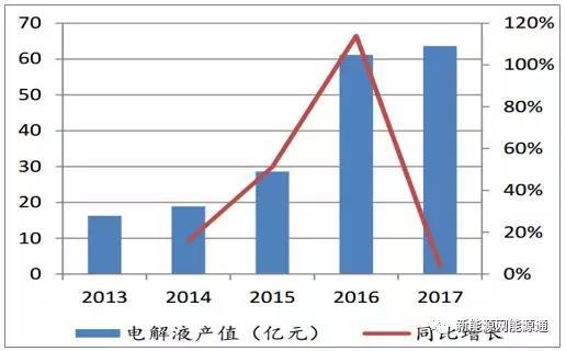 電解液作為鋰電池四大原材料(正極材料、負(fù)極材料、隔膜、電解液)之一,在動(dòng)力電池需求不斷增加的帶動(dòng)下,近年來(lái)產(chǎn)量和產(chǎn)值也實(shí)現(xiàn)了快速增長(zhǎng)。數(shù)據(jù)顯示,2017年我國(guó)電解液產(chǎn)量11萬(wàn)噸,同比增長(zhǎng)23.3%。一方面是由于動(dòng)力電池電解液產(chǎn)量上升;另一方面是由于出口量保持穩(wěn)定增長(zhǎng)。從產(chǎn)值來(lái)看,2017年國(guó)內(nèi)電解液產(chǎn)值為63.6億元,同比增長(zhǎng)3.9%,主要由于原材料六氟磷酸鋰大幅降價(jià)導(dǎo)致電解液價(jià)格大幅下滑,使得電解液產(chǎn)值增速低于產(chǎn)量增速。