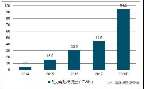受益于新能源汽車市場(chǎng)的高速發(fā)展,動(dòng)力電池的需求得以不斷提升。我國(guó)動(dòng)力電池出貨量從2014年的4.4GWh上升到2017年的44.5GWh,CAGR為116.3%,預(yù)計(jì)到2020年可達(dá)到94.5GWh,未來(lái)三年CAGR在30%左右。