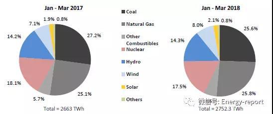 —2018年3月的氣電發(fā)電量同比增長7.3%,同時煤電發(fā)電量同比下降了10.1%。在美國,電力部門中天然氣替代煤最為明顯。