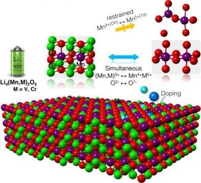 電池陰極的結(jié)構(gòu)示意圖。鋰原子為紅色,氧原子為綠色,錳原子為紫色,鉻原子為深藍(lán)色,釩原子為淺藍(lán)色。