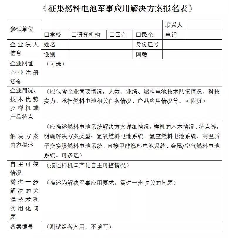 填寫《征集燃料電池軍事應(yīng)用解決方案報(bào)名表》(附后),發(fā)送電子郵件至songshuang_1021@126.com。報(bào)名聯(lián)系人及電話:宋爽,17720519646。