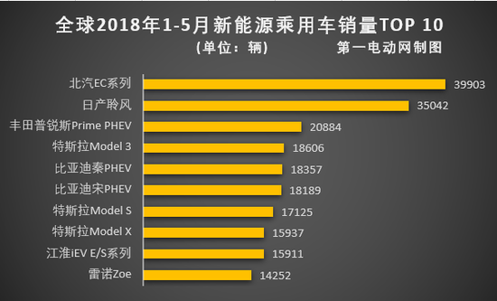 從今年前五個月的累計銷量排名看,北汽EC系列、日產(chǎn)聆風(fēng)、豐田普銳斯Prime PHEV包攬前三。?