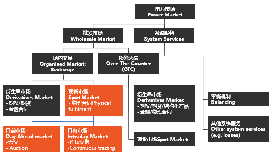 電力市場分為很多個(gè)細(xì)分市場,下圖展示了電力市場的全貌,EPEX SPOT負(fù)責(zé)橙色標(biāo)記的市場。電力市場從結(jié)構(gòu)上分為批發(fā)市場和系統(tǒng)服務(wù),批發(fā)市場主要把電力進(jìn)行商品化,更強(qiáng)調(diào)其經(jīng)濟(jì)屬性,包括場內(nèi)交易和場外交易,場內(nèi)又分為現(xiàn)貨市場和衍生品市場,現(xiàn)貨市場分為日前市場和日內(nèi)市場;而系統(tǒng)服務(wù)是輸電網(wǎng)運(yùn)營的市場,目的是維護(hù)整個(gè)系統(tǒng)的平衡與安全。