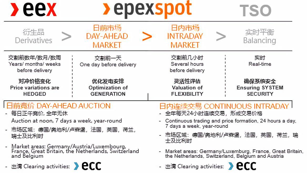 歐洲電力現(xiàn)貨交易所(EPEX SPOT)是歐洲最大的電力現(xiàn)貨交易所一,隸屬于歐洲能源及大宗商品交易中心(EEX集團(tuán)),運(yùn)營法國、德國、奧地利和瑞士等八個(gè)國家的電力現(xiàn)貨市場,約占?xì)W洲總能源消耗的1/3以上,并為東歐四國提供市場建設(shè)和代運(yùn)營服務(wù)。目前EEX集團(tuán)基于歐洲,正在向美國和亞洲發(fā)展。