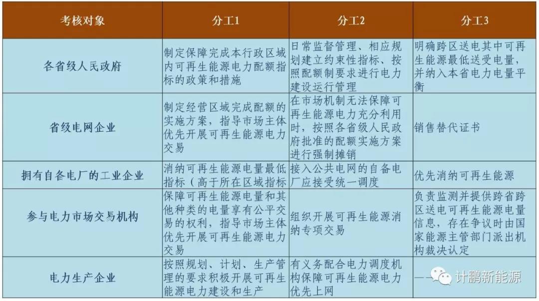 配額制的實施主體是國家電網(wǎng)各省級公司、南方電網(wǎng)各省級公司、其他省級電力公司、擁有自備電廠的工業(yè)企業(yè)(指標(biāo)高)、各類配售電企業(yè)(含社會資本投資的增量配電網(wǎng)企業(yè))、參與電力市場交易的直購電用戶。需要注意的是配額的義務(wù)主體是需求側(cè),不是發(fā)電側(cè)。配額制的實施分工各有不同: