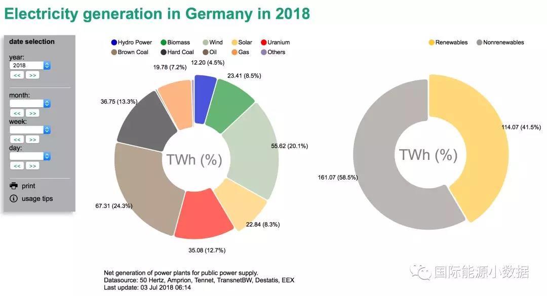 中國儲能網(wǎng)訊:根據(jù)德國ISE研究所的最新數(shù)據(jù),2018年上半年德國發(fā)電總量為113TWh(1130億千瓦時(shí)),可再生能源發(fā)電再創(chuàng)新高,比例達(dá)到41.5%(風(fēng)電20.2%、生物質(zhì)8.5%、太陽能8.3%、水電4.5%),化石能源發(fā)電占比44.8%。以單一電源來看,煤電依然是老大,占發(fā)電量比例為37.6%(褐煤24.3%、硬煤13.3%),其他電源包括核電(12.7%)、天然氣(7.2%)、其他(1%)。