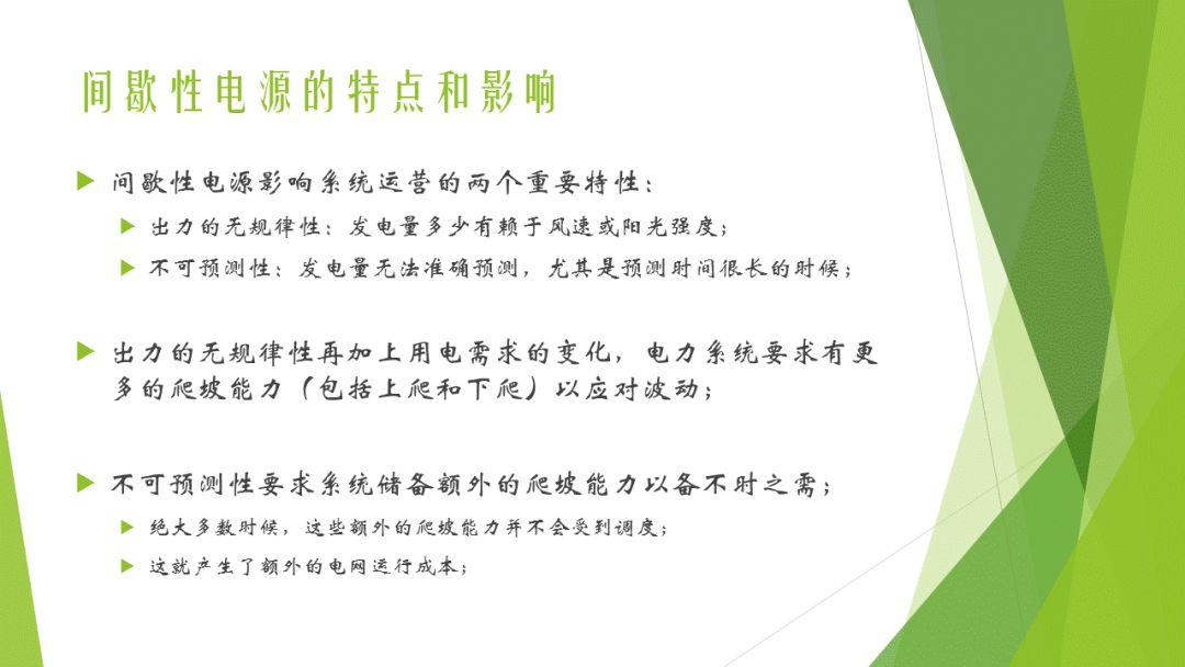 在間歇性電源大規(guī)模接入的情況下,電網(wǎng)需要有更多的靈活性以保障安全:必須要用其他快速反應電源來平衡間歇性電源的波動;必須保證足夠的爬坡度來抵消間歇性電源預測的誤差(包括上調(diào)和下調(diào));電網(wǎng)的阻塞管理更加困難。
