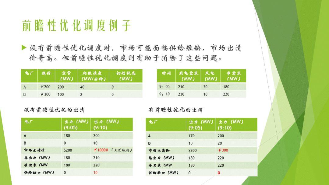 如果有前瞻性優(yōu)化,在9:05時把電廠A的出力降到170MW,電廠B出力10MW,這樣雖然9:05的發(fā)電成本稍微高了一些,但在9:10所有負荷都能夠被滿足,系統(tǒng)出清價為電廠B的報價300¥/MW。