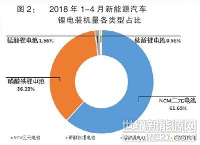數(shù)據(jù)顯示,2018年1-4月新能源汽車鋰電裝機(jī)量8.23GWh,同比增長212.91%。從各類型鋰電看,NCM三元電池裝機(jī)以5.07 GWh占比61.65%,排在第一位。磷酸鐵鋰電池以2.98GWh占比36.23%,排在第二位,市場份額已經(jīng)萎縮至不到四成;錳酸鋰電池以128.76 MWh占比1.56%,排在第三位;鈦酸鋰電池以45.80 MWh占比0.56%,排在最后(見圖2)。