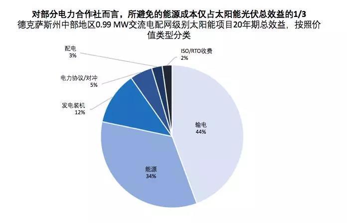 如果被太陽(yáng)能替代的電力越來(lái)越便宜,太陽(yáng)能的價(jià)值怎么會(huì)提高呢?其關(guān)鍵原因在于配網(wǎng)級(jí)別太陽(yáng)能不僅避免了電力批發(fā)成本,還節(jié)約了其他相關(guān)的非能源成本,如配電網(wǎng)絡(luò)、發(fā)電裝機(jī)等基礎(chǔ)設(shè)施建造成本,尤其是輸電部分。