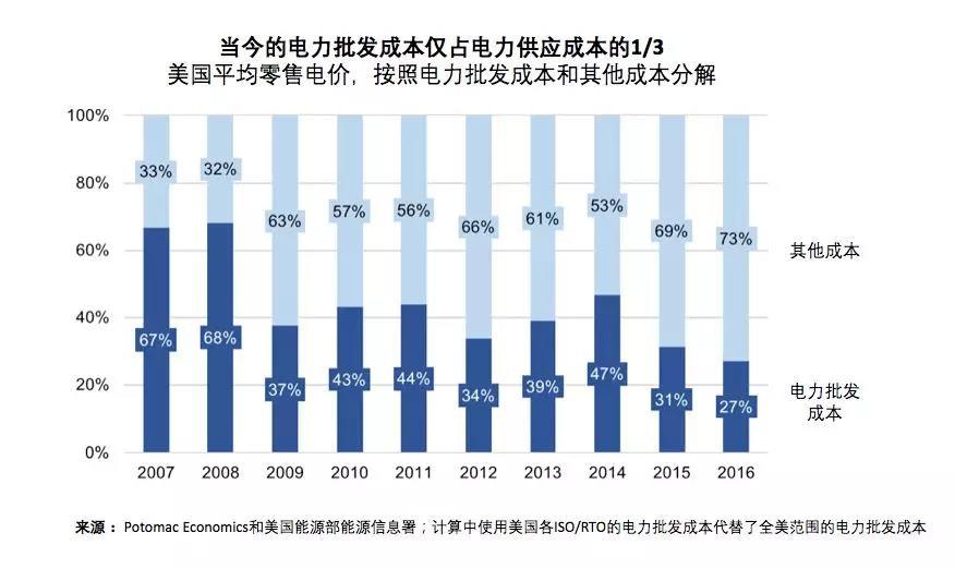 下圖顯示,不包括發(fā)電裝機(jī)攤銷的電力批發(fā)成本如今只占電力供應(yīng)成本的不到30%。這與我們?cè)?0年前看到的成本結(jié)構(gòu)完全相反,當(dāng)時(shí)電力批發(fā)成本占電力供應(yīng)成本的大約70%?,F(xiàn)如今,電力成本的主要部分都被用在了“冰冷的金屬”上——包括電線、電線桿、變壓器、變電站和發(fā)電資產(chǎn)(即使是在停機(jī)狀態(tài)下),及其管理費(fèi)用、維修運(yùn)營(yíng)和稅務(wù)成本等。