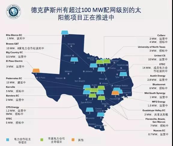 再次聚焦到德克薩斯州,在過(guò)去的3個(gè)月里,圣安東尼奧市政電力公司CPS已對(duì)5 MW裝機(jī)太陽(yáng)能光伏項(xiàng)目進(jìn)行了招標(biāo),同時(shí)另外三家市政電力公司也為7 MW裝機(jī)的太陽(yáng)能光伏項(xiàng)目發(fā)出了招標(biāo)公告。落基山研究所的ShineTM團(tuán)隊(duì)也召集了3家能源買家、2家合作社電力公司和一所位于市政電力公司服務(wù)范圍內(nèi)的大學(xué),為13.25 MW裝機(jī)太陽(yáng)能和太陽(yáng)能加蓄能項(xiàng)目發(fā)出了標(biāo)書(shū)。