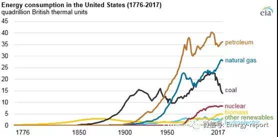 美國(guó)的能源消費(fèi)量在國(guó)家歷史進(jìn)程中經(jīng)歷了許多變化,從木材作為十八、十九世紀(jì)的主要來(lái)源到煤炭和石油利用的開始,再到二十世紀(jì)后期核電的崛起,以及二十一世紀(jì)初的可再生能源的逐步爆發(fā)。