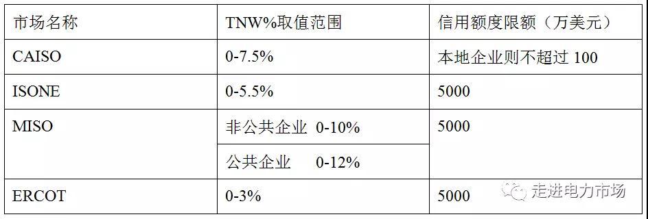 市場主體的信用評分必須不低于50分,才有對應的無抵押信用額度,否則無抵押信用額度為零。并且PJM還對不同信用等級的主體設置了不同的無抵押信用額度限額,最多不得超過5000萬美元。不同的電力市場的TNW%取值是不一樣的,對于給出無抵押信用額度限額的市場,F(xiàn)ERC要求所有電力市場的無抵押信用限額都不得超過5000萬美元。北美幾個主要電力市場的無抵押信用額度限額如表2所示。