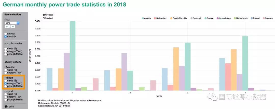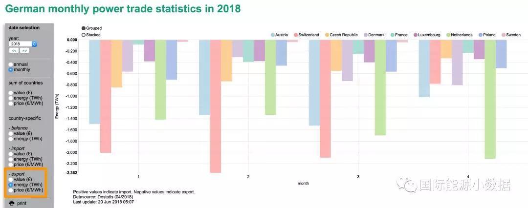 中國(guó)儲(chǔ)能網(wǎng)訊:2018年1月至4月,德國(guó)出口電力28.878 TWh,進(jìn)口電力8.759 TWh,凈出口20.119 TWh。