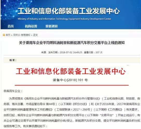 中國(guó)儲(chǔ)能網(wǎng)訊:2018年7月2日,工信部裝備工業(yè)司發(fā)布通知,以紅頭文件形式宣布“乘用車企業(yè)平均燃料消耗量與新能源汽車積分管理平臺(tái)”正式上線。至此,雙積分政策正式完成全部政策框架搭建工作,中國(guó)乘用車企業(yè)雙積分交易大幕正式開(kāi)啟。