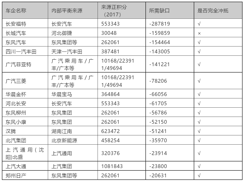 具體而言,長(zhǎng)安福特、四川一汽豐田、廣汽菲亞特、廣汽三菱等均可依靠長(zhǎng)安汽車等同一中方關(guān)聯(lián)企業(yè)進(jìn)行內(nèi)部的油耗積分平衡;華晨金杯等需要通過(guò)華晨寶馬這一外資品牌來(lái)進(jìn)行輸血;東風(fēng)汽車(含東風(fēng)日產(chǎn))、東風(fēng)柳州、東風(fēng)小康僅僅依靠東風(fēng)集團(tuán)的26.2萬(wàn)余分還不足以全部沖抵,但可以通過(guò)東風(fēng)的關(guān)系設(shè)法從東風(fēng)本田(手握18萬(wàn)余分)那里劃撥一部分積分,但需要走一些內(nèi)部程序;唯一有困難的是長(zhǎng)城汽車,關(guān)聯(lián)企業(yè)僅僅為河北御捷,但近13萬(wàn)的負(fù)分缺口實(shí)在難以彌補(bǔ),必須通過(guò)市場(chǎng)外購(gòu)新能源汽車積分來(lái)解決了。