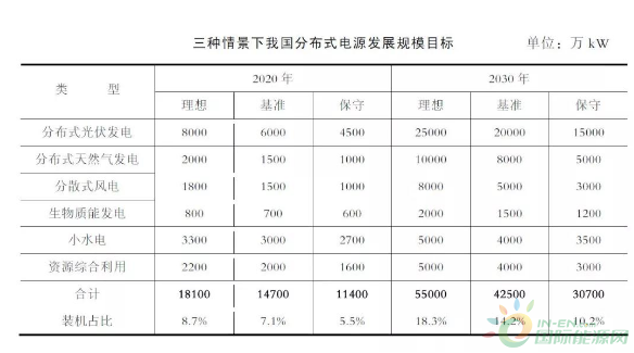 根據(jù)國家《能源發(fā)展“十三五”規(guī)劃》《2014—2020 年能源行動計劃》《可再生能源發(fā)展“十三五”規(guī)劃》《電力發(fā)展“十三五”規(guī)劃》相關內容,2020 年分布式光伏發(fā)電、分布式天然氣發(fā)電開發(fā)規(guī)模達到國家規(guī)劃目標,2030 年分布式光伏發(fā)電、分布式天然氣發(fā)電開發(fā)規(guī)模應滿足實現(xiàn)國家戰(zhàn)略目標的要求;分散式風電、生物質能發(fā)電、小水電和資源綜合利用開發(fā)規(guī)模達到相關規(guī)劃或資源量約束目標。