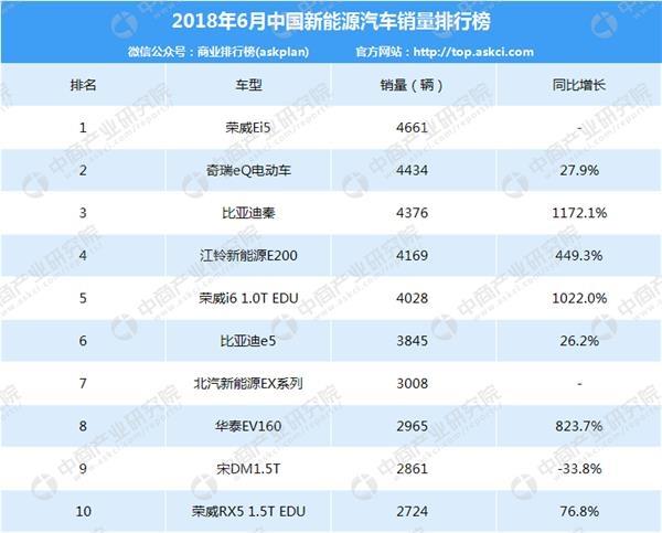 6月銷量排名前十的車型依次為榮威Ei5、奇瑞eQ電動(dòng)車、比亞迪秦、江鈴新能源E200、榮威i61.0TEDU、比亞迪e5、北汽新能源EX系列、華泰EV160、宋DM1.5T、榮威RX51.5TEDU。