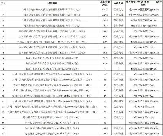 7月6日,國(guó)家電投公示了用于海興、壽陽(yáng)、大同二期、達(dá)拉特、白城五大領(lǐng)跑基地共計(jì)1.338GW的組件中標(biāo)結(jié)果。最終五家企業(yè)瓜分了此次超過(guò)1.2GW的領(lǐng)跑者組件訂單,分別為億晶光電(511MW)、合肥晶澳(238MW)、錦州陽(yáng)光(228MW)、泰州中來(lái)(144MW)、東方環(huán)晟(120MW)。