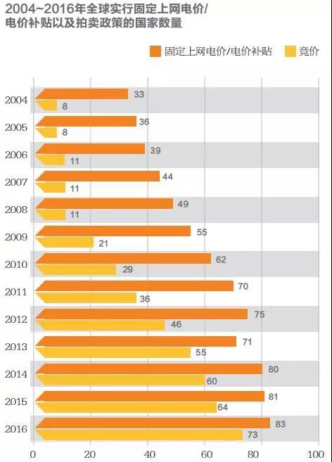 在所有的政策類型之中,采用固定電價(或上網(wǎng)電價補貼)與拍賣機制的國家數(shù)量最多,到2016年分別達到了83個和73個。