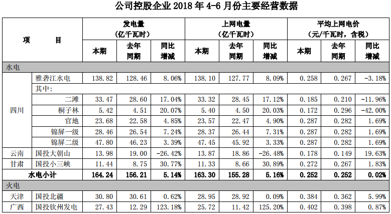2018年4-6月份公司控股企業(yè)平均上網(wǎng)電價(jià)0.315元/千瓦時(shí),與去年同期相比增加了6.83%;2018年1-6月份公司控股企業(yè)平均上網(wǎng)電價(jià)0.322元/千瓦時(shí),與去年同期相比增加了5.91%。