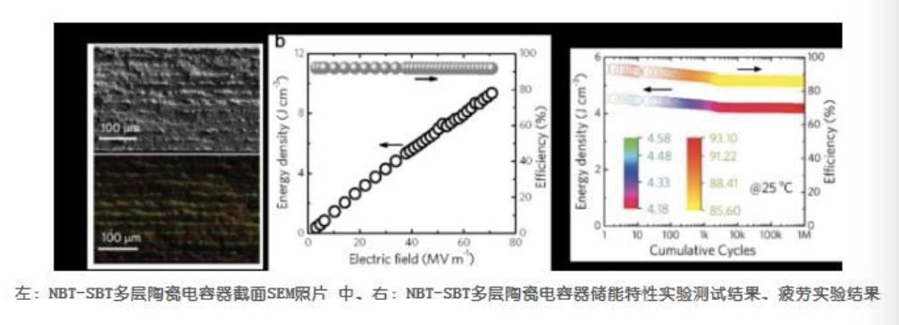 左:NBT-SBT多層陶瓷電容器截面SEM照片 中、右:NBT-SBT多層陶瓷電容器儲(chǔ)能特性實(shí)驗(yàn)測(cè)試結(jié)果、疲勞實(shí)驗(yàn)結(jié)果