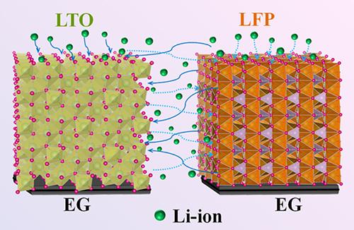 最近,該研究團隊率先開發(fā)出一種全固態(tài)平面集成化的鋰離子微型電池。該鋰離子微型電池以納米鈦酸鋰納米球為負極,磷酸鐵鋰微米球為正極,高導(dǎo)電石墨烯為非金屬集流體,離子凝膠為電解液,具有平面十指交叉構(gòu)型且無需使用傳統(tǒng)隔膜和金屬集流體。獲得的鋰離子微型電池具有多方向傳質(zhì)的優(yōu)勢,表現(xiàn)出高體積能量密度125.5mWh/cm3,優(yōu)異的倍率性能;超長的循環(huán)穩(wěn)定性,3300次循環(huán)后容量基本沒有衰減;以及良好的機械柔性,在反復(fù)彎曲或扭曲下其電極結(jié)構(gòu)無損壞以及電化學(xué)性能無明顯變化。同時,該微型儲能器件能在100°C的高溫環(huán)境下穩(wěn)定工作且具有長循環(huán)穩(wěn)定性(1000次循環(huán))。此外,該鋰離子電池無需金屬連接體便能實現(xiàn)模塊化自集成,實現(xiàn)輸出電壓和容量的有效調(diào)控。因此,該鋰離子微型電池在柔性化、微型化電子器件的應(yīng)用中具有很大潛力。