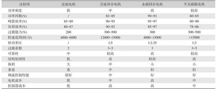 目前驅(qū)動(dòng)電機(jī)主要分為直流電機(jī)、交流電機(jī)及輪轂電機(jī)等;其中,直流和交流電機(jī)又可進(jìn)一步劃分。目前行業(yè)對(duì)交流異步電機(jī)、永磁同步電機(jī)及開(kāi)關(guān)磁阻電機(jī)關(guān)注度較高。通過(guò)對(duì)常見(jiàn)的幾種電機(jī)進(jìn)行比較分析可知(見(jiàn)表 1),永磁同步電機(jī)具有效率高、轉(zhuǎn)速范圍寬、體積小、重量輕、功率密度大、成本低等優(yōu)點(diǎn),成為純電動(dòng)乘用車(chē)市場(chǎng)的主要驅(qū)動(dòng)電機(jī)。