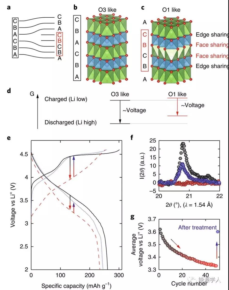 圖5. 恢復富鋰氧化物材料中的電壓的路徑。(a-c)由部分位錯誘導的氧層堆積修飾的示意圖,由部分位錯誘導的氧層堆積修飾的示意圖(a),兩個額外的氧層O3序列ABCABC(b)分解O1樣序列ABC BC ABC(c);(d)在吉布斯自由能圖中,邊緣共享八面體導致能量上最有利的配置。(e)Li-金屬作為陽極的富鋰層狀陰極的充放電電壓曲線;(f)在50個循環(huán))以及在熱處理之后結(jié)構(gòu)峰強度的演變;(g)在2032型半電池中測量的前50個循環(huán)(黑色至紅色符號)和熱處理后(藍色符號)的平均放電電壓,處理后恢復放電電壓。
