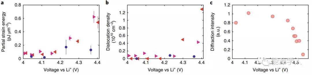 圖4. 層狀氧化物單顆粒的應變能量圖。(a)圖2和3中所示的LRLO和NCA顆粒的部分應變能;( b)Operando演化的相同粒子的位錯密度;(c)在第一次充電期間使用來自大量顆粒的X射線衍射原位測量的上部結(jié)構(gòu)衍射峰強度的演變。