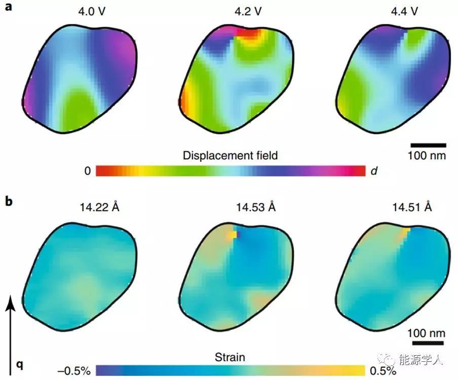 圖3. 在充電期間原位變化NCA納米顆粒。在充電期間原位捕獲的單個NCA顆粒沿(001)方向(垂直于層)的位移場(a)和應變(b)