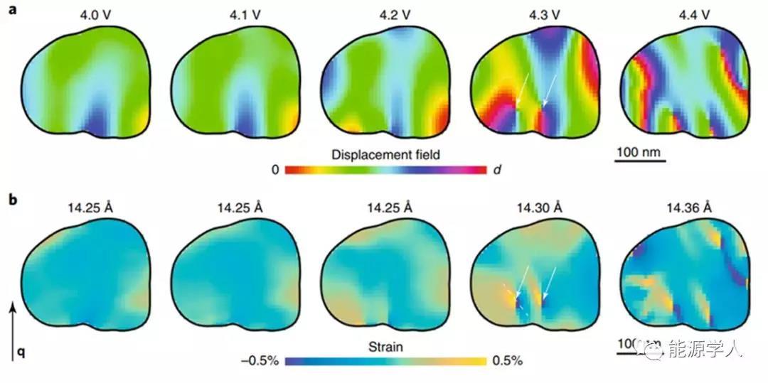 圖2.在電化學充電過程中LRLO納米粒子的原位變化。(a)在充電期間穿過納米顆粒的平面中沿q的位移場的變化;(b)從a中的3D位移場計算的納米粒子內(nèi)部沿(001)方向(垂直于層)的應變。