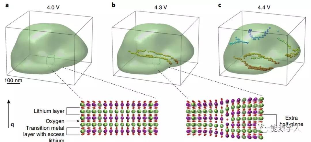 圖1. 在充電期間形成位錯網(wǎng)絡(a)在4.0V的電荷狀態(tài)下,在顆粒中未觀察到位錯;(b)在4.3V時,在鋰脫出過程中形成了兩個邊緣位錯;(c)4.4 V時出現(xiàn)位錯網(wǎng)絡