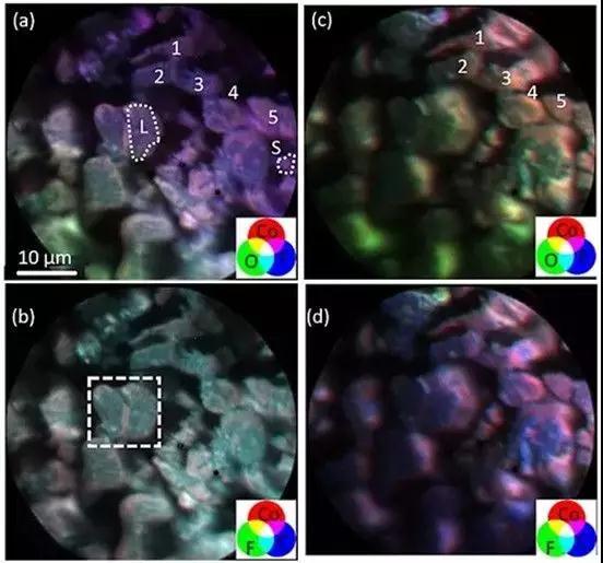 首先利用PEEM的元素敏感性對(duì)于電極成分,包括鈷酸鋰、PVdF以及導(dǎo)電炭黑的分布進(jìn)行納米級(jí)別的成像。