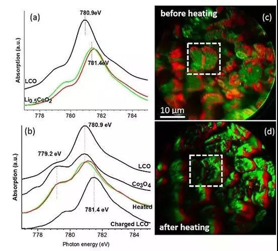 相分離成像是對(duì)每一像素單元鈷元素的吸收光譜使用單一相,包括Co2+(熱失控釋放氧形成的相)、Co3+(LCO)或Co3.5+(正常滿充電的LCO)的光譜分解擬合。相分離的高度不均勻性在圖c和d得到很好體現(xiàn)。
