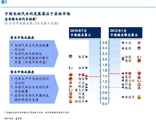 麥肯錫的電動汽車指數(shù)可以被用來衡量一個國家是否有足夠準(zhǔn)備支持電動汽車產(chǎn)業(yè)。該指數(shù)從供給和需求角度對一個國家的電動汽車成熟度進(jìn)行評估:根據(jù)本國汽車廠商規(guī)劃的電動汽車產(chǎn)量等指標(biāo)進(jìn)行供給衡量,根據(jù)對車主提供的優(yōu)惠措施和基礎(chǔ)設(shè)施投資水平等指標(biāo)進(jìn)行需求衡量。麥肯錫的電動汽車指數(shù)表明中國在供給和需求的得分都相對較低。而且中國電動汽車整體成熟度從2010年7月的第三位降至2012年2月的第五位,排在日本、美國、法國和德國之后(圖3)。