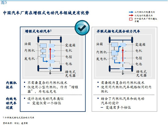 中國式電動汽車可能會是增程式電動汽車。我們的研究表明,增程式電動汽車(即串聯(lián)式插電式混合動力汽車)— 內(nèi)置小型內(nèi)燃機(jī)以在行駛過程為電池不斷充電的電動汽車,可能對于中國相對滯后的汽車行業(yè)來講成本更低、也更容易實(shí)施。