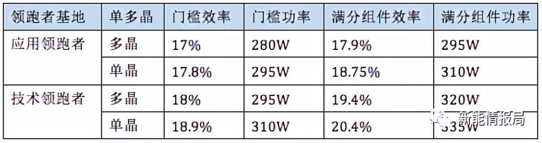能源局規(guī)定了2017年領(lǐng)跑者基地采用多單晶組件的門(mén)檻效率與滿分效率指標(biāo),其中應(yīng)用領(lǐng)跑者基地采用的多晶組件和單晶組件的滿分轉(zhuǎn)換效率分別為17.9%和18.7%,對(duì)應(yīng)組件功率應(yīng)達(dá)到295W和310W;技術(shù)領(lǐng)跑基地采用的多晶組件和單晶組件的滿分轉(zhuǎn)換效率分別為19.4%和20.4%,對(duì)應(yīng)組件功率為320W和335W(如下表)。